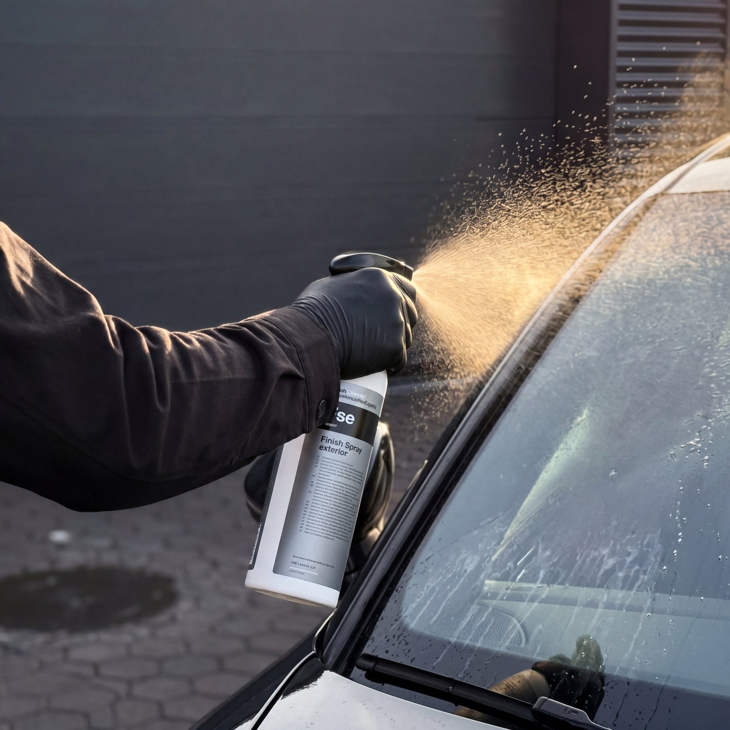 Koch-Chemie Finish Spray Exterior only works reliably on cool, dry surfaces. On hot sheet metal after direct sunlight, the spray dries too quickly and leaves residues instead of removing them. Park the vehicle in the shade beforehand and wait five minutes. If the surface is still noticeably warm to the touch, do not start yet.