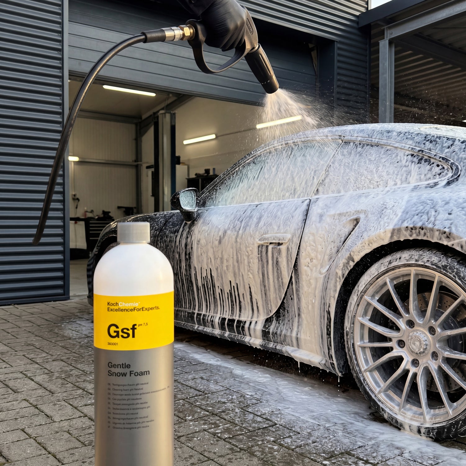 Koch-Chemie Gentle Snow Foam Gsf – Foam lance spraying dense cleaning foam onto the 911 Turbo S