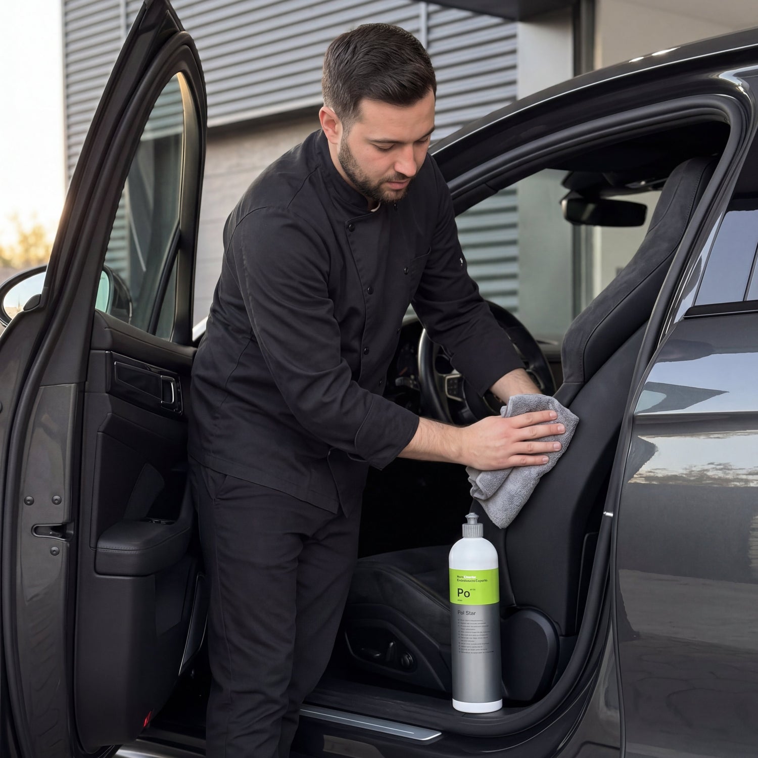 For a complete interior workflow, combine Pol Star with two other products from the Koch-Chemie line. Before Pol Star cleaning, the vacuum cleaner is used — without this step, you would only spread loose dirt in the material. After Pol Star cleaning, material-specific care products follow: Top Star "Ts" for hard plastic surfaces in the cockpit and Leather Star for smooth leather seats. This three-step process — vacuuming, Pol Star, material finish — takes about 45 minutes for a mid-range station wagon and covers the entire interior cleaning up to the window frame.