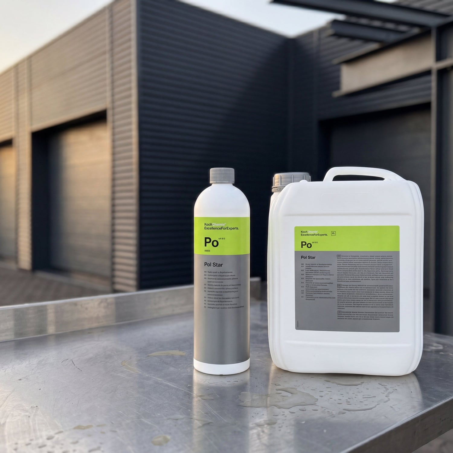 Koch-Chemie production in Unna manufactures Pol Star in green label bottles — this is the manufacturer's internal color code for neutral pH products and a reliable sorting signal when multiple Koch-Chemie products are on the shelf at the same time. In the workshop, you can thus grab the right bottle without reading labels and avoid confusion with acidic or alkaline cleaners from the same series.