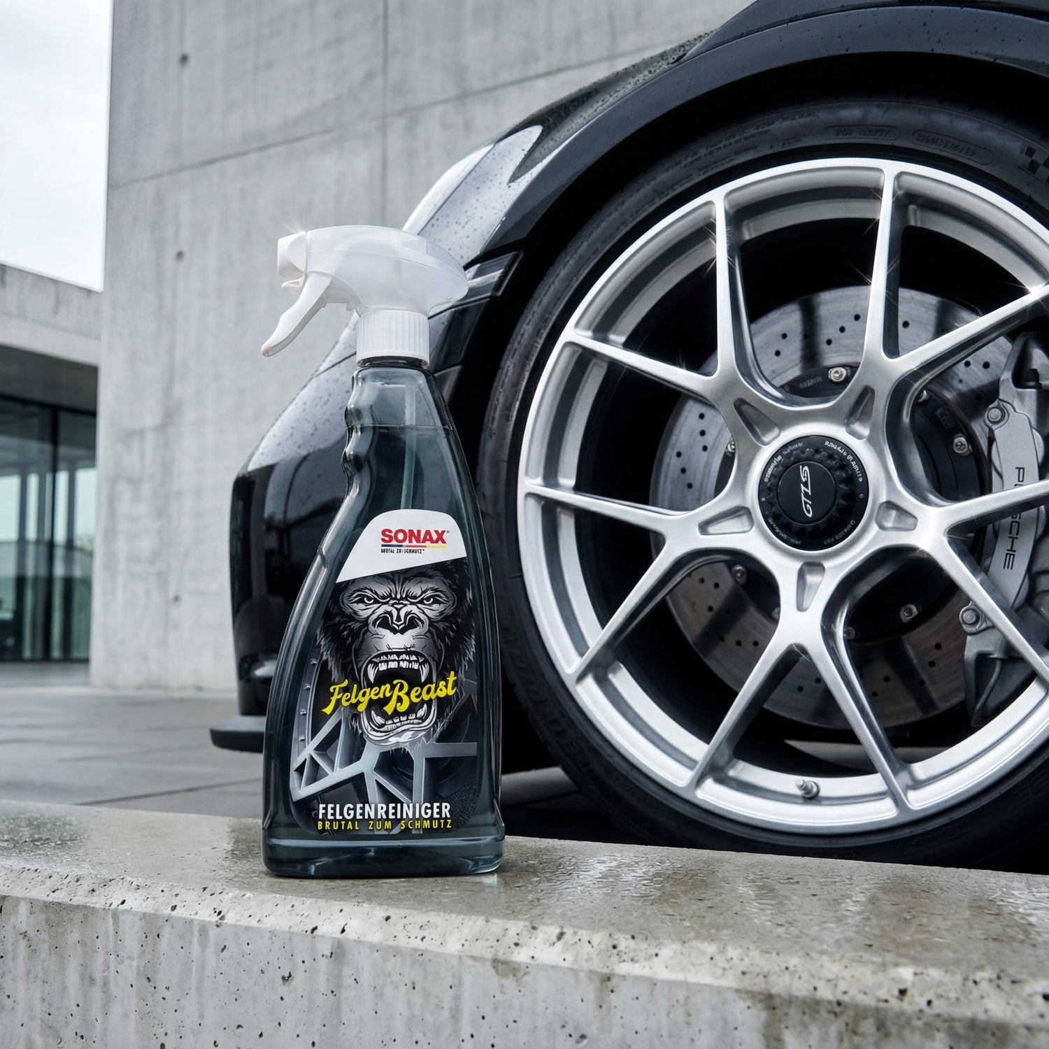 SONAX FelgenBeast spray bottle in front of Porsche 911 GT3 RS wheel