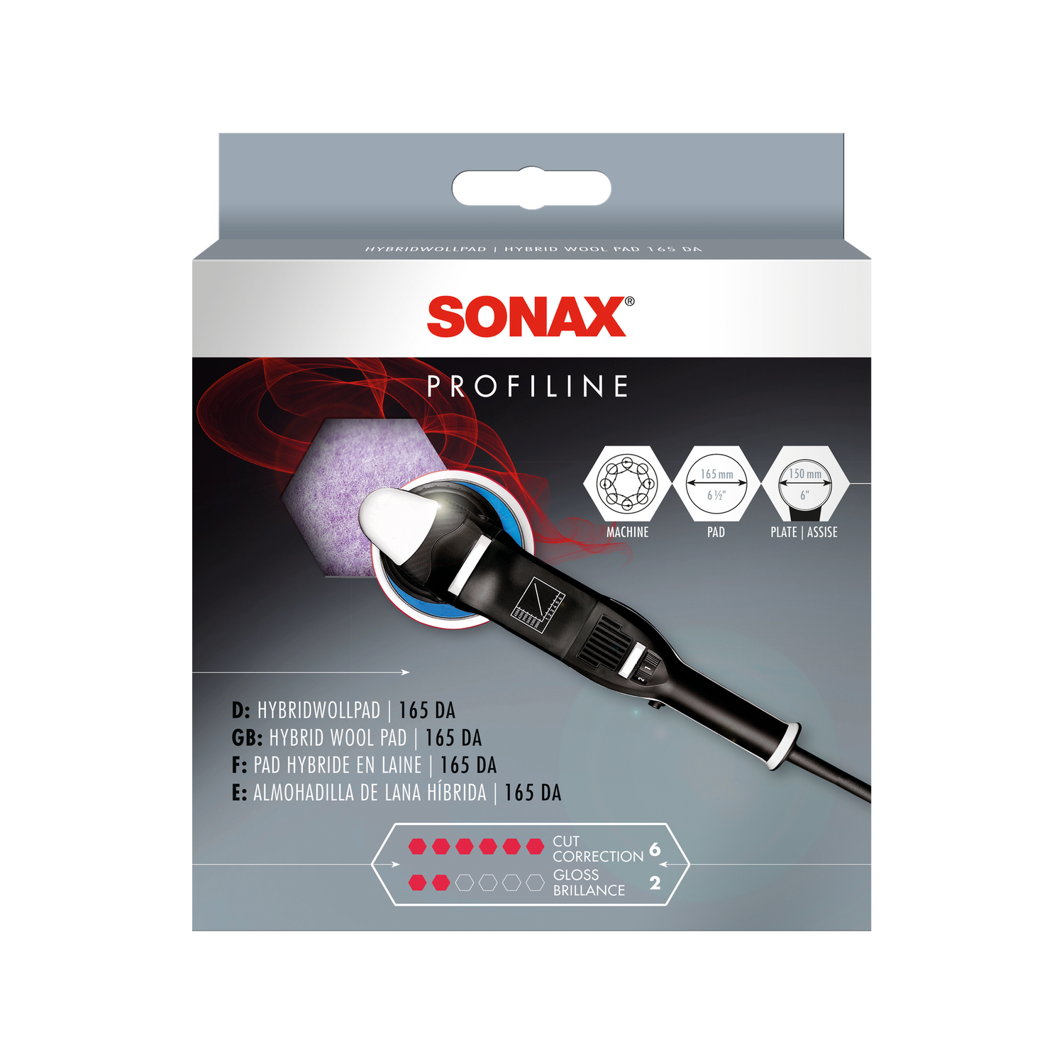 The HybridWoolPad is designed for use with heavy-cut polishes. The recommended combination in the PROFILINE system is the HybridWoolPad with SONAX PROFILINE CutMax "6/4" abrasive polish or PROFILINE UltimateCut "6+/3" — the strongest polishes in the range. These combinations are designed for vehicles with severe P800-P1000 sanding marks, deep oxidation, or heavy holograms from machine pre-treatments.