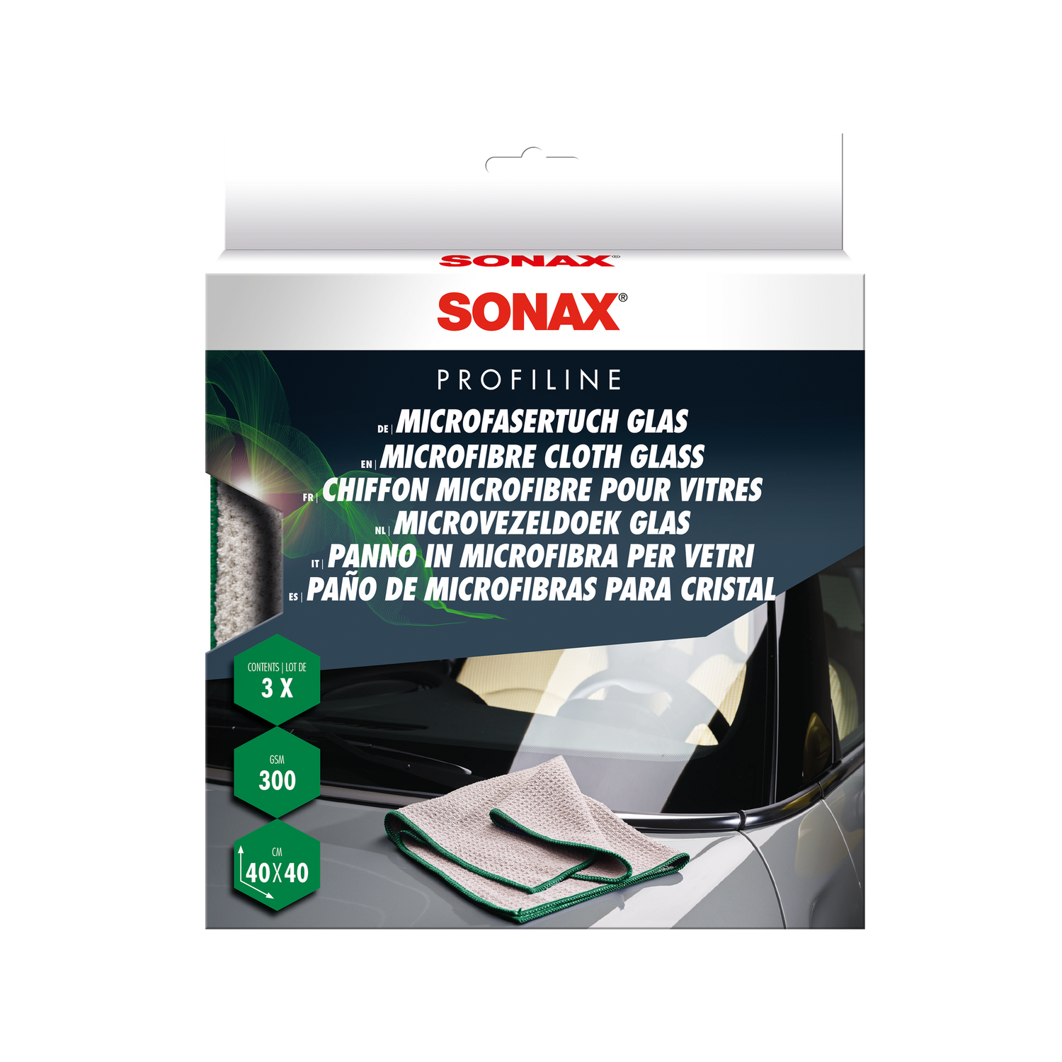 - 3-piece set for professional multi-pane use without interruption. The SONAX PROFILINE Microfiber Cloth Glass is available in a set of three — ideal for professional use where multiple panes are cleaned one after another. For optimal results, a single cloth should not be used for all panes of a vehicle once it is visibly saturated. With three cloths, work can be done efficiently: one cloth for the windshield, one for the side windows, one as a reserve. After use, the cloths are collected in a separate laundry bag and washed together with the SONAX PROFILINE Microfibre Wash.
