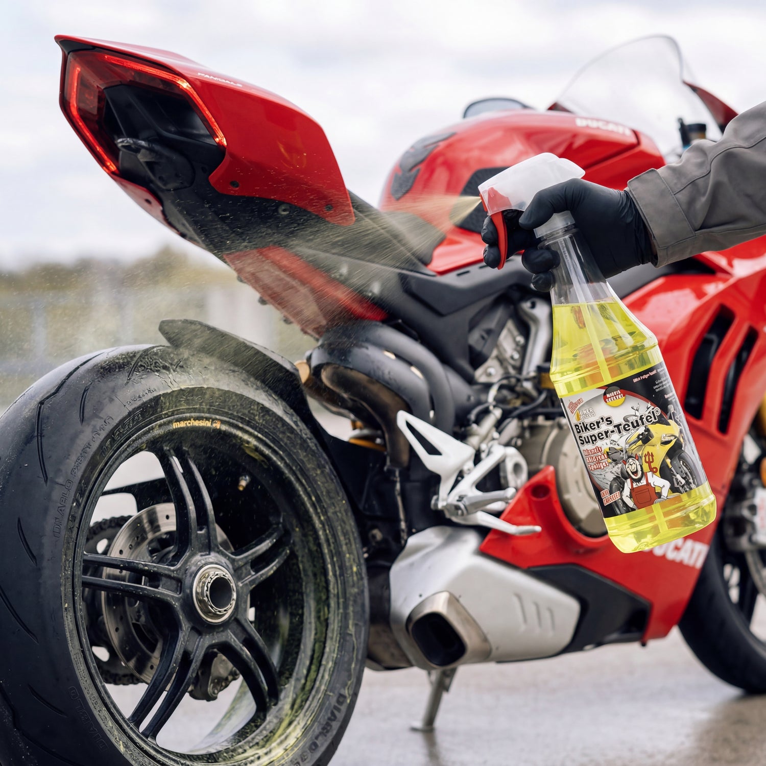 • One cleaner for the entire machine, not an arsenal of special products. Biker's Super-Teufel typically replaces separate wheel cleaner, chain cleaner, and insect remover. This saves space on the workshop shelf, time on the bike, and money on re-purchases. For extreme cases — burnt-on chain spray after 5,000 kilometers or surface rust on the engine block — a special product is still useful, but this one cleaner fully covers 90 percent of normal motorcycle care.
