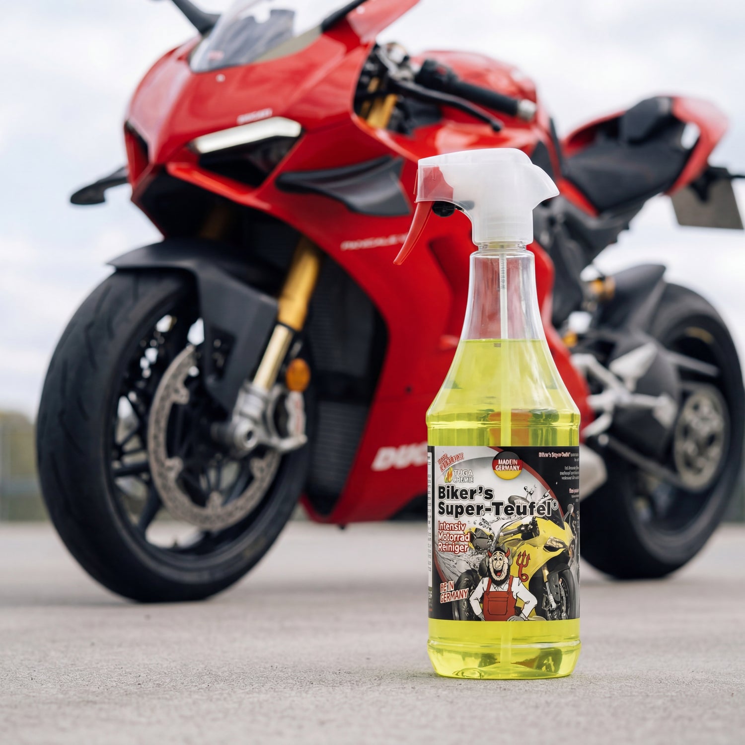 What is Biker's Super-Teufel? An alkaline, acid-free motorcycle cleaner from TUGA Chemie that dissolves chain grease, oil film, brake dust, insect residue, and road grime in one step. One bottle for fairing, frame, rims, engine block, chain set, and exhaust — no five different special cleaners, no multiple dwell times. Not for matte paints without pre-testing, not for open bearings or unprotected electronics, not on hot engine parts.