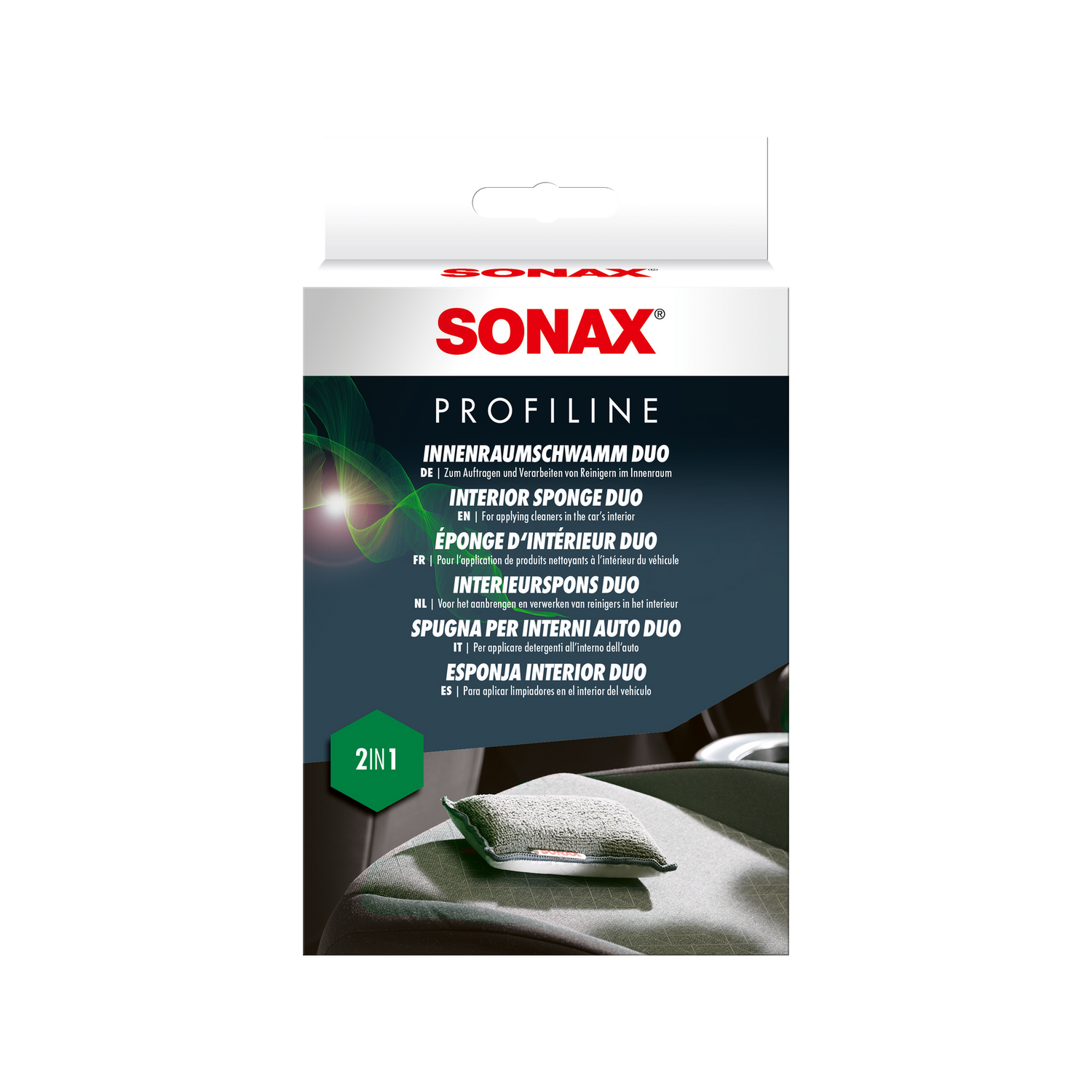 Was macht den SONAX PROFILINE InnenraumSchwamm "Duo" besonders? Der Applikationsschwamm mit zwei funktionalen Seiten verbindet schonende Reinigungswirkung auf der strukturierten Seite mit gleichmäßiger Produktapplikation auf der glatten Seite — ideal für Kunststoffpflege, Lederpflege und Innenraumreinigung.