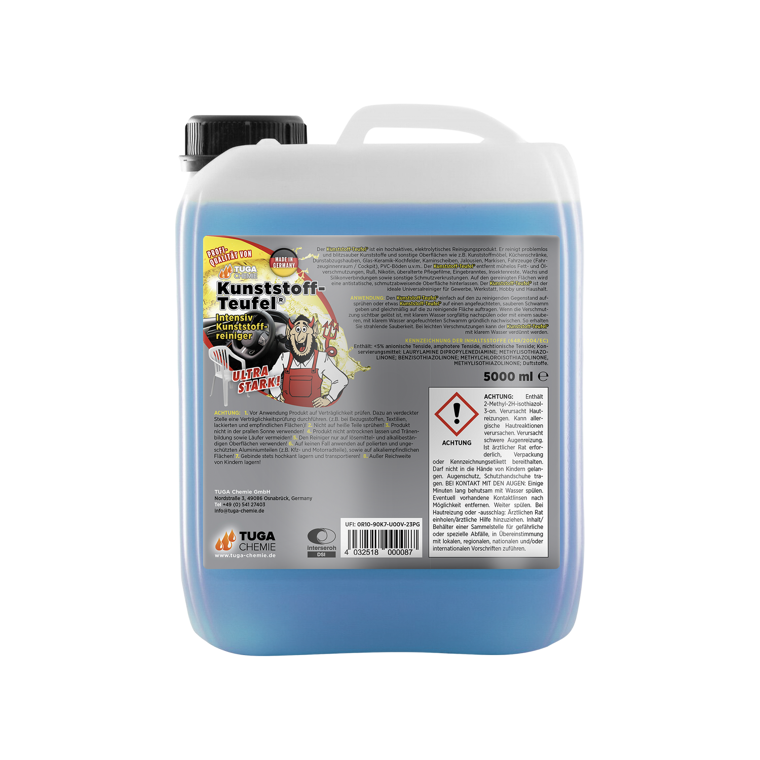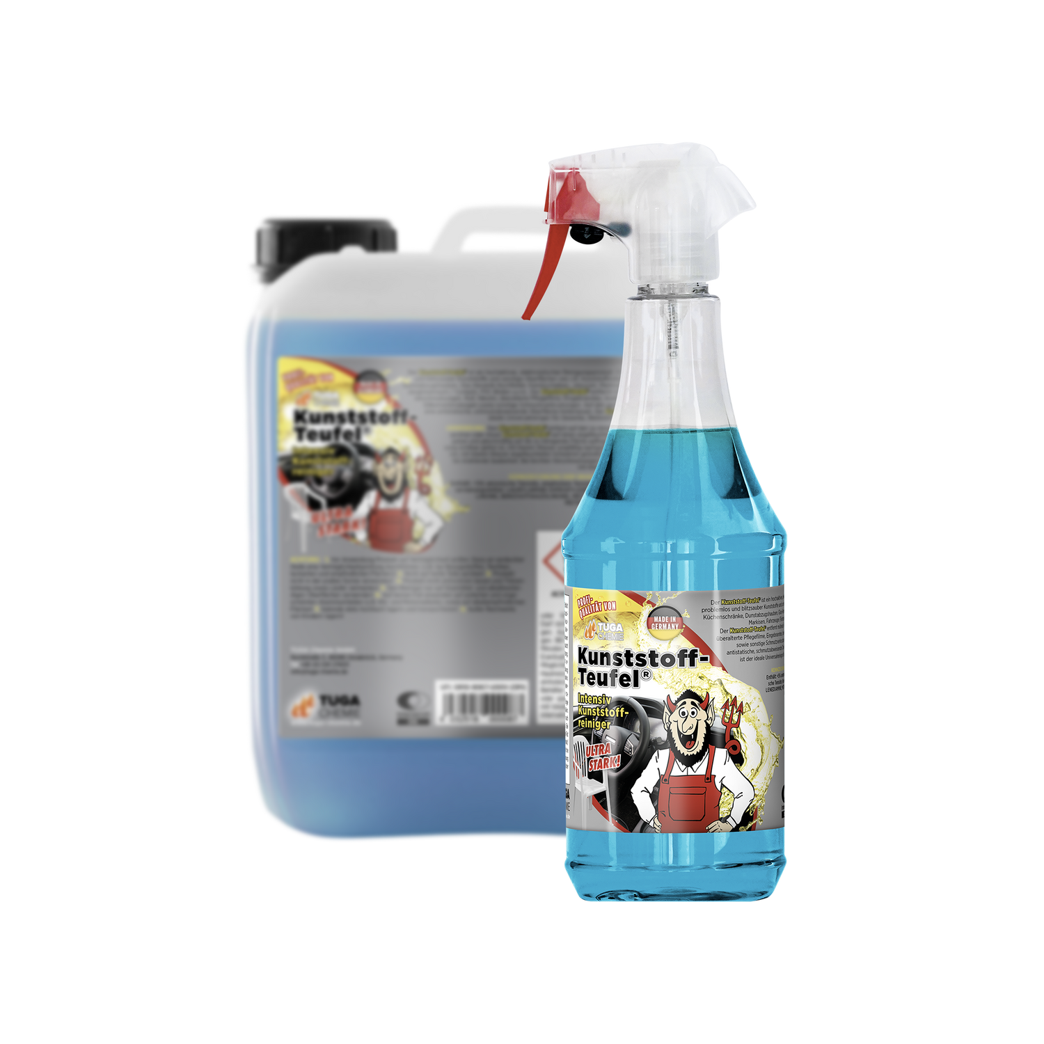Der Tuga Chemie Kunststoff-Teufel® ist ein kraftvoller Innenraumreiniger für Kunststoff, Vinyl und Gummi, der hartnäckige Verschmutzungen, Fettfilme und Alltagsschmutz gründlich entfernt und Oberflächen sichtbar sauber sowie natürlich matt hinterlässt.